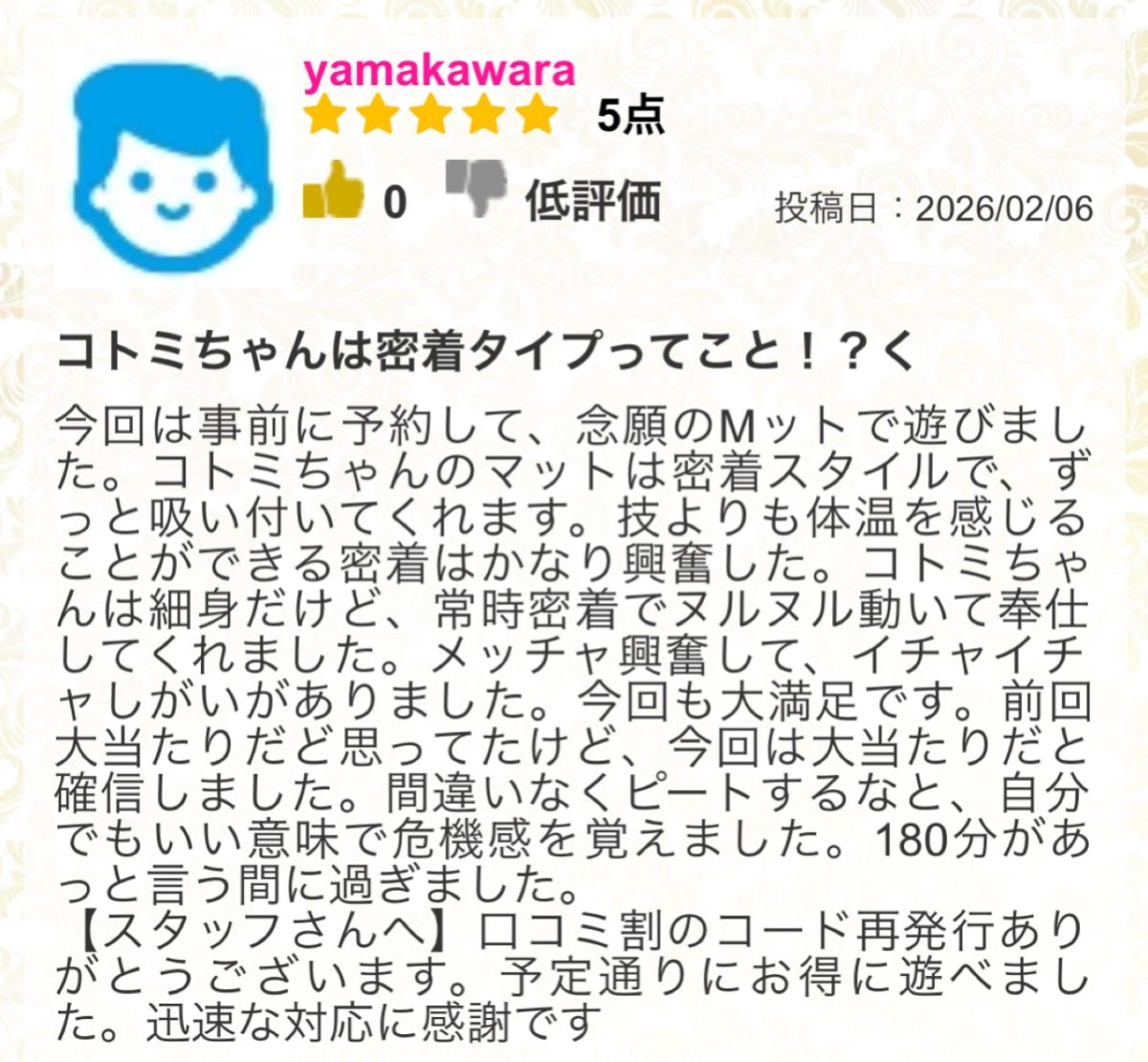 ありがとう 2026/02/13 20:41:49 女の子とお店をフォローします いいね! yamakawaraさん♥口コミいただいてたのにお返事遅くなっちゃいました💦ありがとうございます🙇♀またヌルヌルイチャイチャしようね🎵お逢いできる日を楽しみにしてます☺ことみ 女の子とお店をフォローします いいね! この日記をXに投稿する