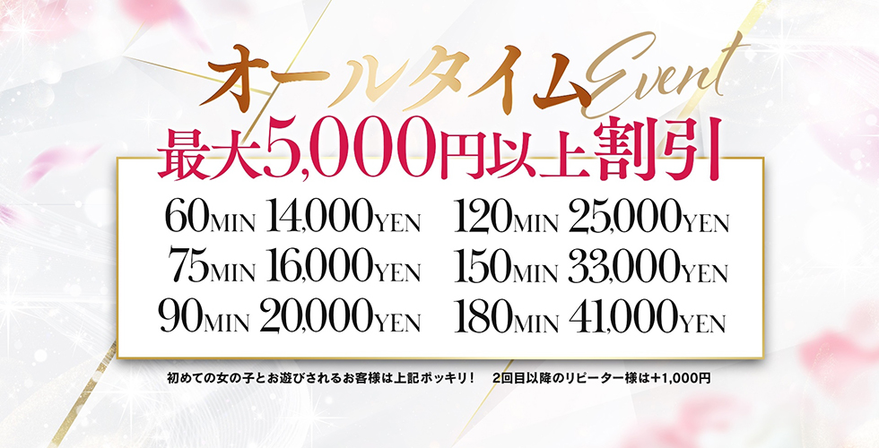 ※2回目以降のリピーター様はプラス1,000円※なんと…!!★★最大5,000円以上OFFの割引です★★対象キャストを幅広く設定しております!お電話で「オールタイム割見た!」とお伝え下さい♪ショップデータ人妻吐息